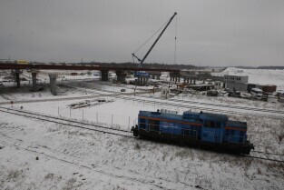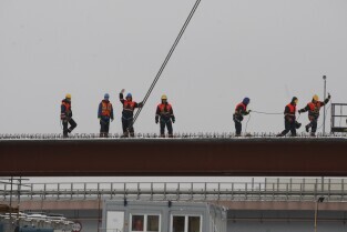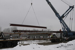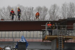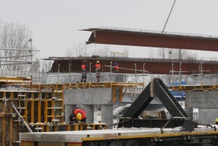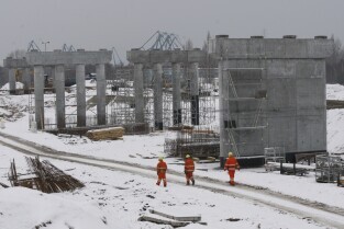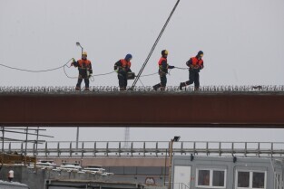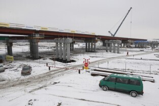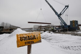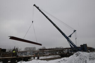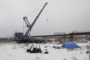 Gdańsk. Budowa II odcinka Trasy Sucharskiego. Montaż przęseł na podporach wiaduktów WD-7 i WD-8. Do tej operacji wykorzystanywany jest dźwig o nośności 650 ton.
