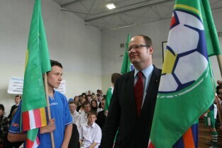Gimnazjum nr 2 w Gdańsku. Wmurowanie kamienia węgielnego pod budowę boiska w ramach Programu "Junior Gdańsk 2012". Nz. Prezydent Gdańska Paweł Adamowicz