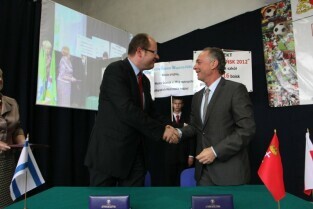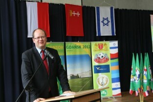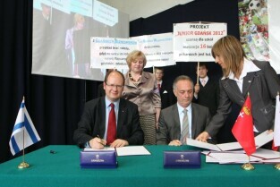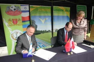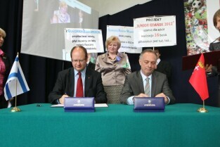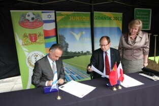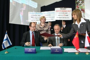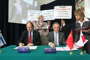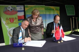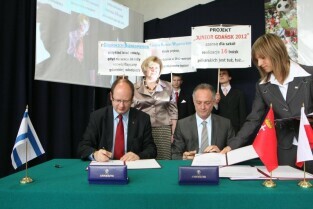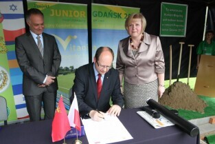 Gimnazjum nr 2 w Gdańsku. Wmurowanie kamienia węgielnego pod budowę boiska w ramach Programu "Junior Gdańsk 2012". Nz. umowę podpisują: od lewej Prezydent Gdańska Paweł Adamowicz i Prezes Vitania Group Poland Roni Livni, w tle stoi Dyrektor Gimnazjum nr 2 Małgorzata Perzyna