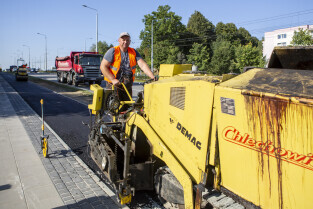 Prace asfaltowe na budowanej drodze rowerowej wzdłuż ul. Bulońskiej. Gdańsk, Piecki-Migowo