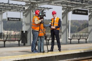 Gdańsk Brętowo. Budowa przystanku Pomorskiej Kolei Metropolitalnej "Brętowo" i przystanku tramwajowego na linii Siedlce - Piecki-Migowo. Nz. Z-ca Prezydenta Gdańska Piotr Grzelak podczas udzielania wywiadu TVP Gdańsk