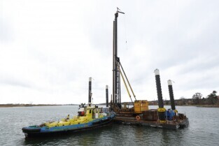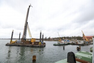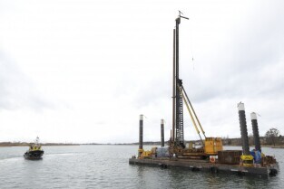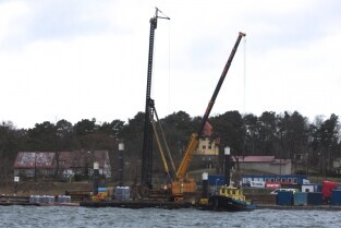 Palowanie dna rzeki pod budowę konstrukcji mostu na Wyspę Sobieszewską