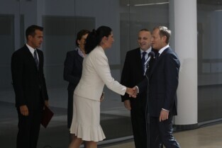 Uroczystość zakończenia budowy Centrum Medycyny Inwazyjnej Uniwersytetu Medycznego w Gdańsku. Nz. od prawej: Premier RP Donald Tusk, Rektor GUMed-u prof. Janusz Moryś, Dyrektor Naczelny uniwersyteckiego Centrum Klinicznego Ewa Książek - Bator, Sekretarz Stanu Kancelarii Prezydenta RP Sławomir Nowak