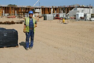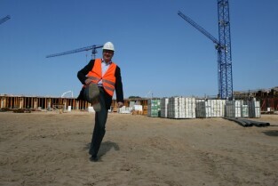 Gdańsk Letnica. Budowa stadionu na EURO 2012. Na zdjęciu Prezydent Gdańska Paweł Adamowicz odwiedzający budowę "kopie piłkę" w miejscu, gdzie będzie środek murawy