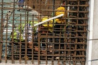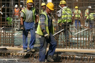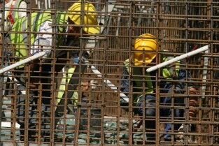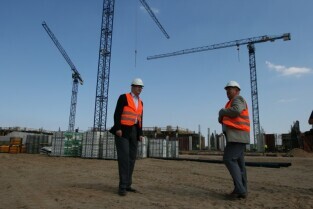 Gdańsk Letnica. Budowa stadionu na EURO 2012. Na zdjęciu Prezydent Gdańska Paweł Adamowicz i Prezes spółki BIEG 2012 Ryszard Trykosko (w jasnej marynarce) odwiedzający budowę