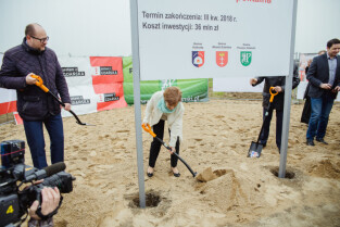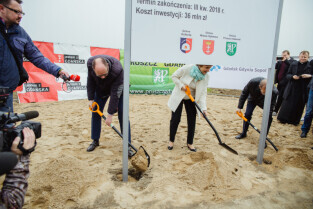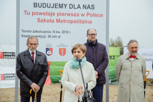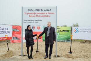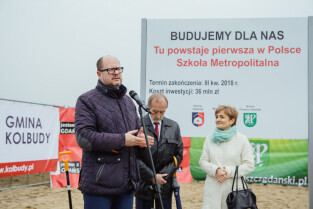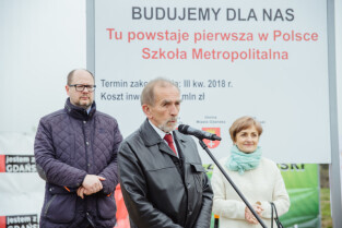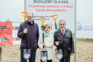 Budowa szkoły metropolitalnej w Kowalach - pierwsza łopata. Nz. Paweł Adamowicz Prezydent Miasta Gdańska, Magdalena Kołodziejczak - Wójt Gminy Pruszcz Gdański i Leszek Grombala - Wójt Gminy Kolbudy
