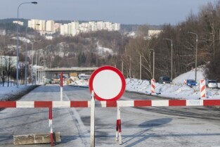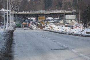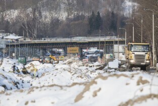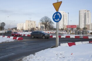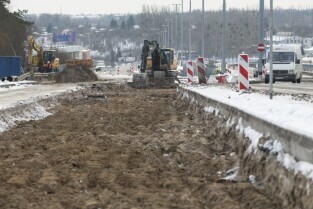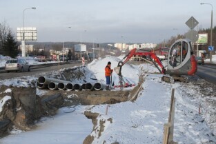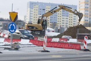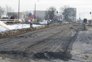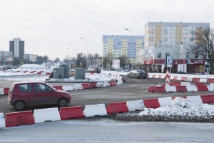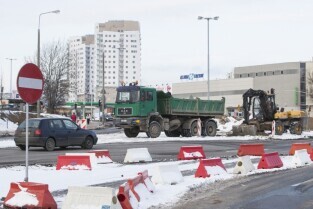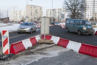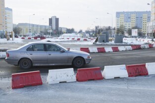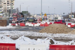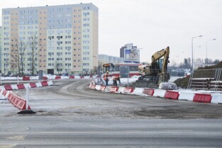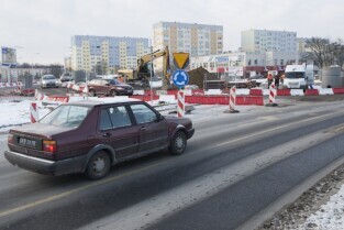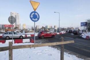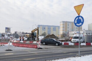 Budowa nowej linii tramwajowej w dzielnicy Piecki Migowo (popularnie zwanej "Morena") połączona z przebudową ul. Rakoczego. Nz. tymczasowa organizacja ruchu na skrzyżowaniu ulic: Bulońska i Rakoczego