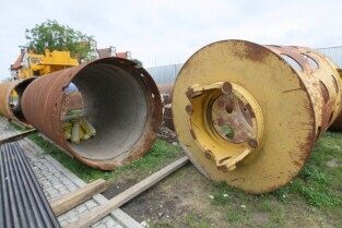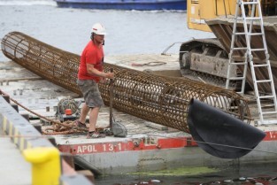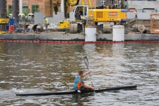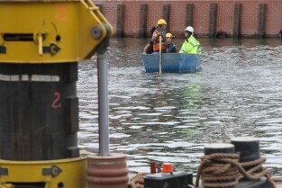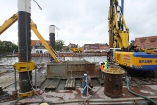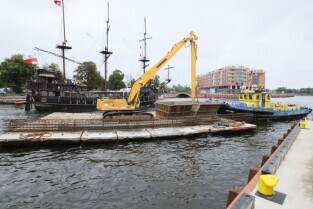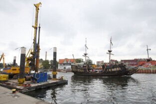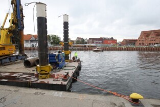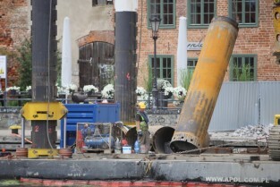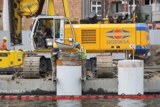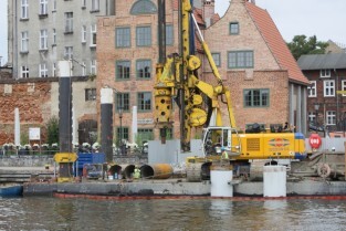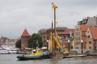 Gdańsk. Budowa zwodzonej kładki dla pieszych przez Motławę pomiędzy wyspą Ołowianką a nabrzeżem Głównego Miasta w rejonie dawnego Zamku Krzyżackiego.