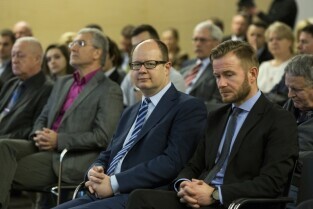 Konferencja "Nowe możliwości rozwoju regionu Pomorza, Budownictwo SMART 3E, efektywność - ekologia - energetyka". Gdańsk, Amber Expo. Nz. Prezydent Gdańska Paweł Adamowicz i Członek Zarządu Woj. Pomorskiego Ryszard Świlski
