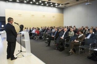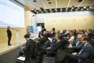Konferencja "Nowe możliwości rozwoju regionu Pomorza, Budownictwo SMART 3E, efektywność - ekologia - energetyka". Gdańsk, Amber Expo. Nz. Nz. Adam Roszczyk (Gdański Klaster Budowlany), wykład "Budownictwo SMART 3E (efektywność, ekologia, energetyka) - nowy rozdział w rozwoju Pomorza 2014-2020"
