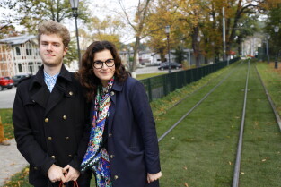 Gdańsk. Budżet Obywatelski 2022 – projekt „Zielone torowisko tramwajowe". Autorem projektów zielonych torowisk jest Cezary Kamiński. Nz. Prezydent Gdańska Aleksandra Dulkiewicz i Cezary Kamiński.