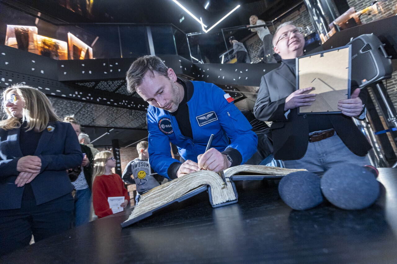 Gdańsk. Polski astronauta dr. Sławosz Uznański-Wiśniewski przekazał do Muzeum Bursztynu fragment bursztynu, który podróżował z nim na orbicie okołoziemskiej. W uroczystości oprócz polskiego astronauty, udział wzięli przewodnicząca Rady Miasta Agnieszka Owczarczak, Tomasz Wierzchowski - Zastępca Dyrektora ds. Technicznych Muzeum Gdańska, kierownik Muzeum Bursztynu, Renata Adamowicz oraz Robert Pytlos.