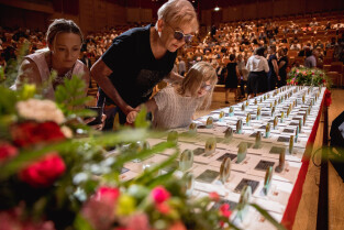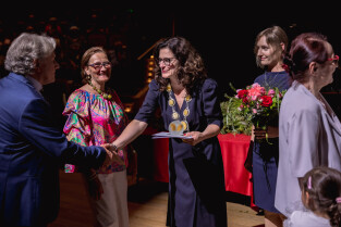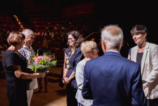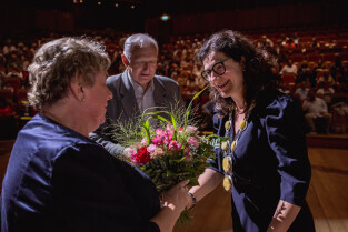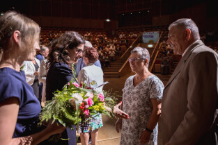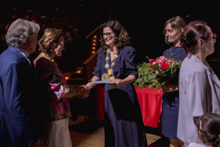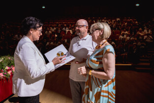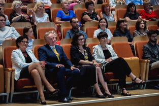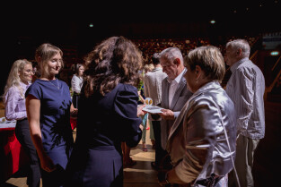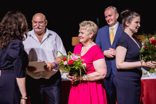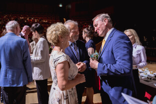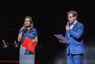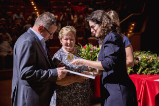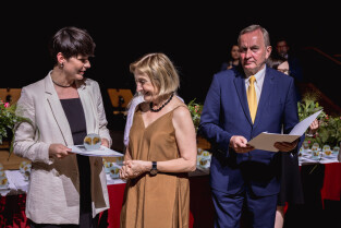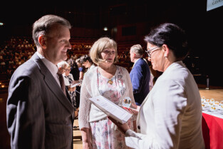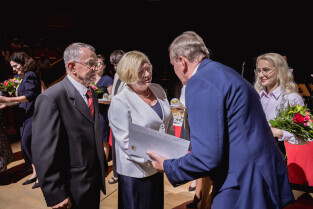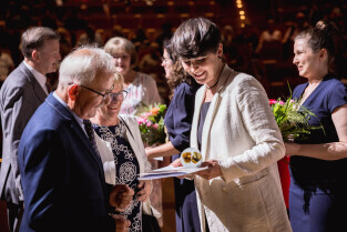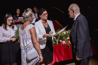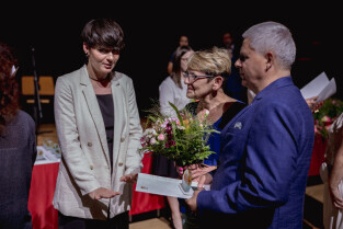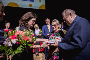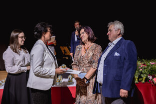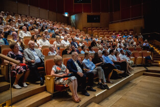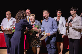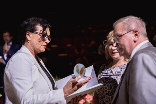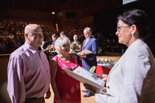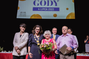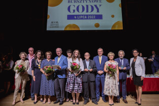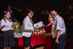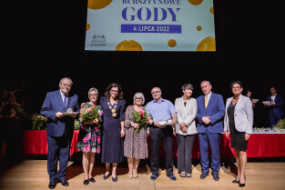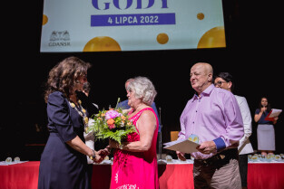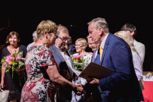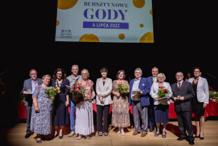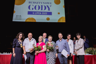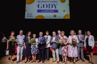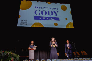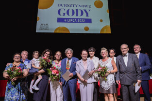 Gdańsk, Filharmonia Bałtycka. Bursztynowe Gody, uroczystość 44. rocznicy zawarcia związku małżeńskiego. Dyplomy i bursztynowe upominki jubilatom wręczała prezydent Gdańska Aleksandra Dulkiewicz, Grażyna Gorczyca kierownik USC, Grzegorz Graefling z-ca kierownika USC i Emilia Kohut wiceprezes Krajowej Izby Gospodarczej Bursztynu. Wieczór uświetnił koncert Alicji Majewskiej i Włodzimierza Korcza