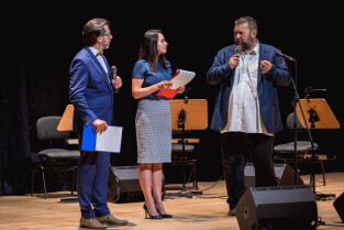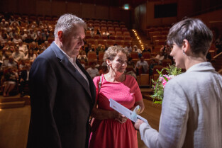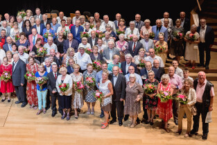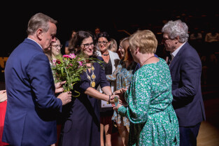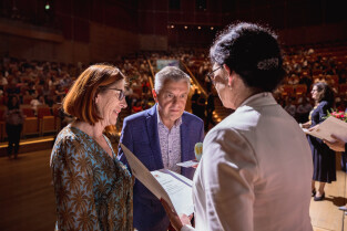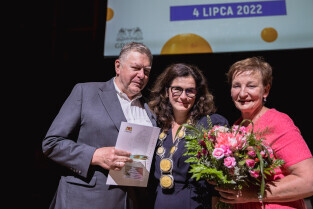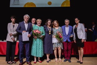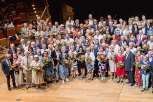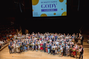Gdańsk, Filharmonia Bałtycka. Bursztynowe Gody, uroczystość 44. rocznicy zawarcia związku małżeńskiego. Dyplomy i bursztynowe upominki jubilatom wręczała prezydent Gdańska Aleksandra Dulkiewicz, Grażyna Gorczyca kierownik USC, Grzegorz Graefling z-ca kierownika USC i Emilia Kohut wiceprezes Krajowej Izby Gospodarczej Bursztynu. Wieczór uświetnił koncert Alicji Majewskiej i Włodzimierza Korcza