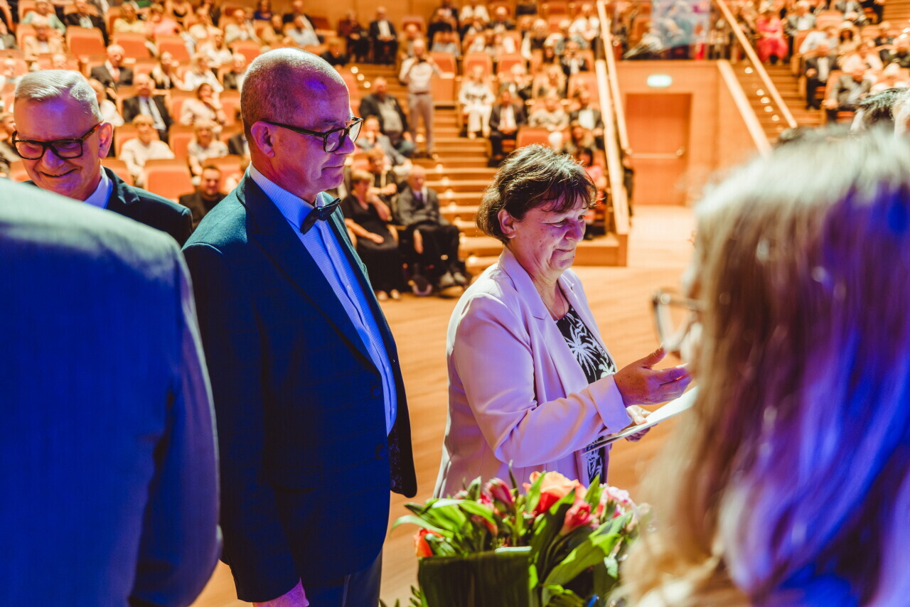 Gdańsk. W sali koncertowej Polskiej Filharmonii Bałtyckiej niemal 100 par odebrało z rąk prezydent Aleksandry Dulkiewicz gratulacje oraz wyjątkowe statuetki z bursztynem bałtyckim