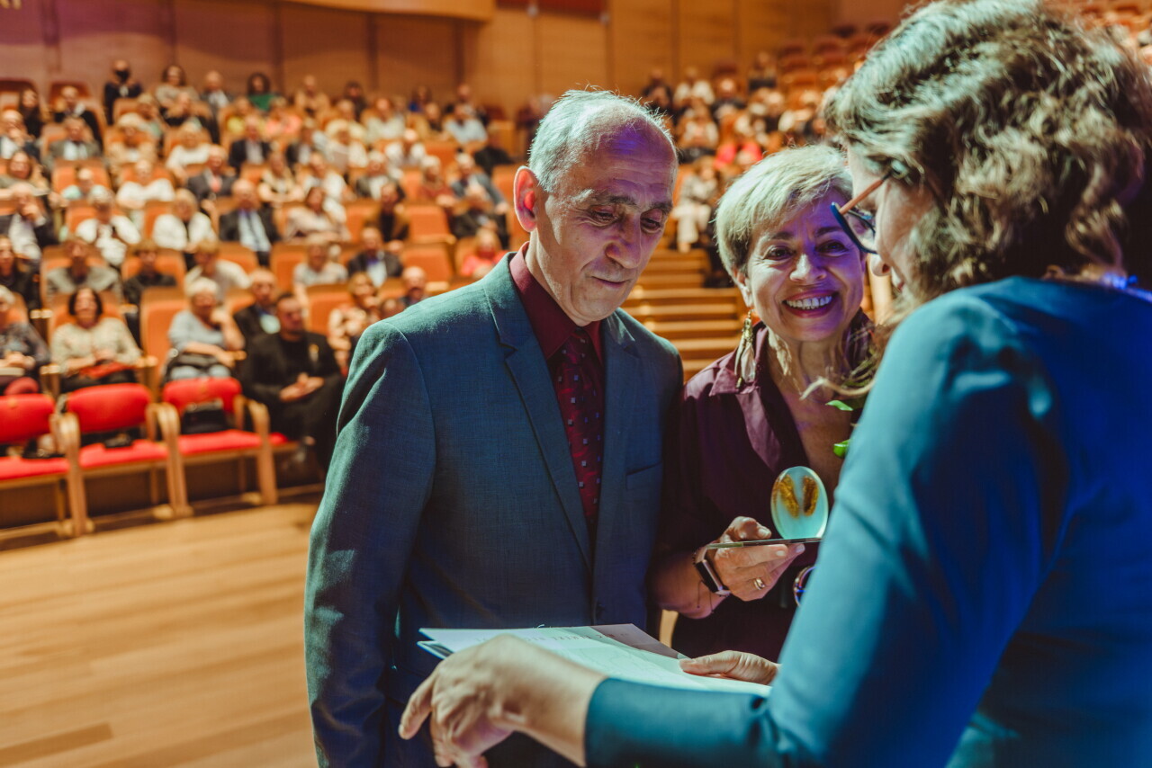 Gdańsk. W sali koncertowej Polskiej Filharmonii Bałtyckiej niemal 100 par odebrało z rąk prezydent Aleksandry Dulkiewicz gratulacje oraz wyjątkowe statuetki z bursztynem bałtyckim