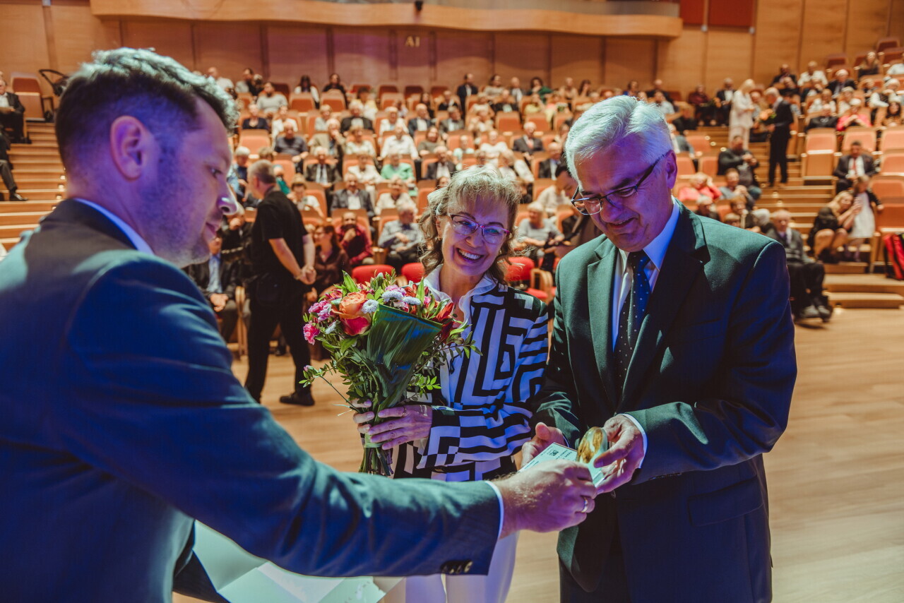 Gdańsk. W sali koncertowej Polskiej Filharmonii Bałtyckiej niemal 100 par odebrało z rąk prezydent Aleksandry Dulkiewicz gratulacje oraz wyjątkowe statuetki z bursztynem bałtyckim