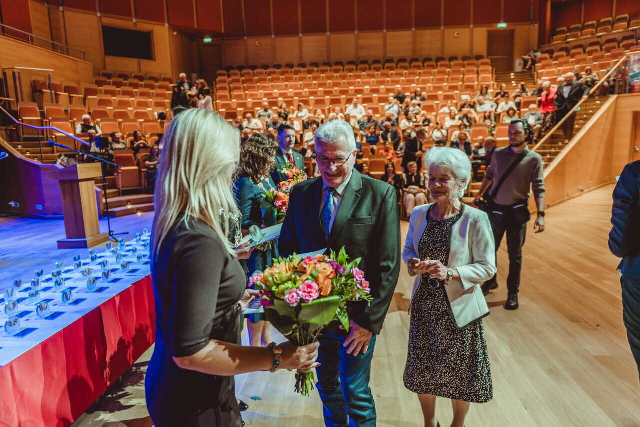 Gdańsk. W sali koncertowej Polskiej Filharmonii Bałtyckiej niemal 100 par odebrało z rąk prezydent Aleksandry Dulkiewicz gratulacje oraz wyjątkowe statuetki z bursztynem bałtyckim