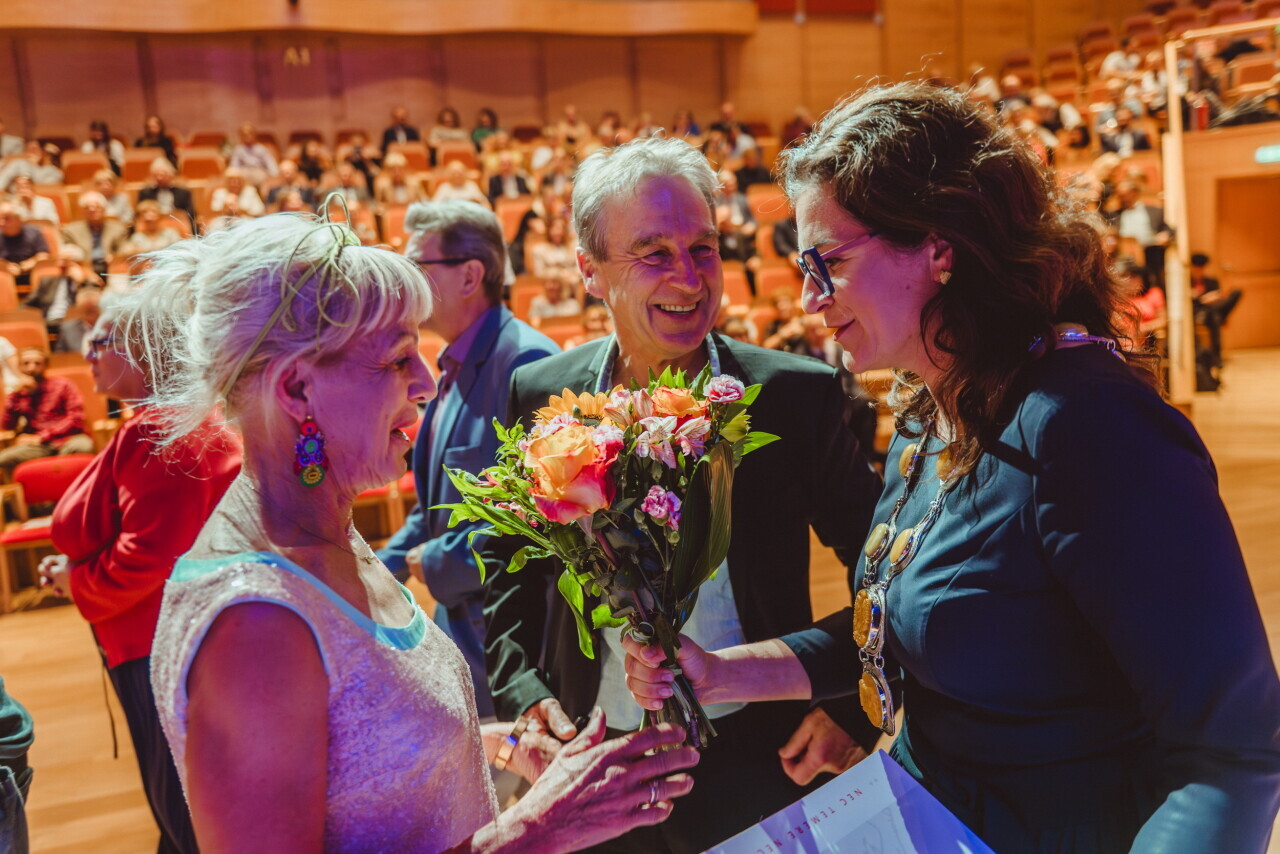 Gdańsk. W sali koncertowej Polskiej Filharmonii Bałtyckiej niemal 100 par odebrało z rąk prezydent Aleksandry Dulkiewicz gratulacje oraz wyjątkowe statuetki z bursztynem bałtyckim
