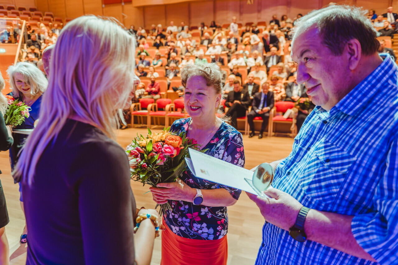Gdańsk. W sali koncertowej Polskiej Filharmonii Bałtyckiej niemal 100 par odebrało z rąk prezydent Aleksandry Dulkiewicz gratulacje oraz wyjątkowe statuetki z bursztynem bałtyckim