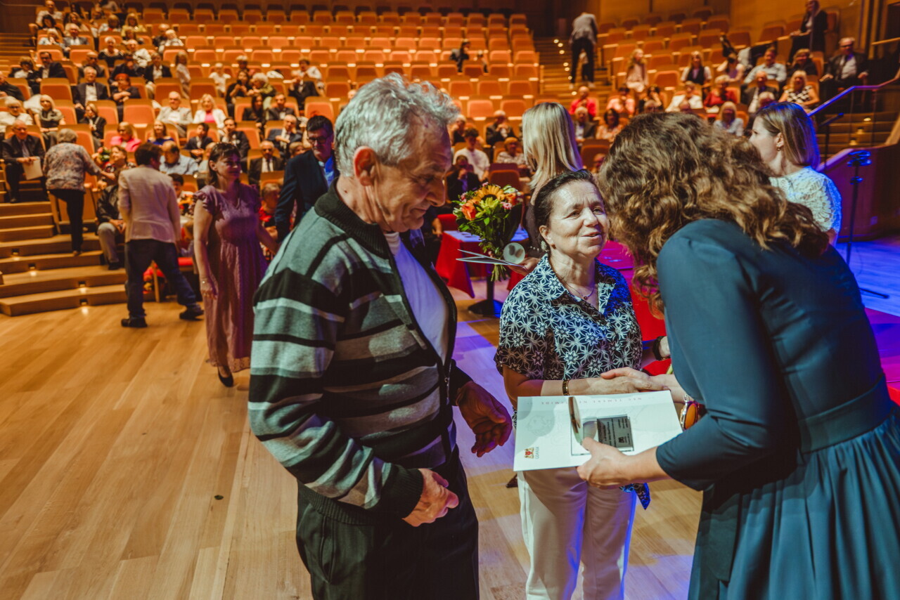 Gdańsk. W sali koncertowej Polskiej Filharmonii Bałtyckiej niemal 100 par odebrało z rąk prezydent Aleksandry Dulkiewicz gratulacje oraz wyjątkowe statuetki z bursztynem bałtyckim