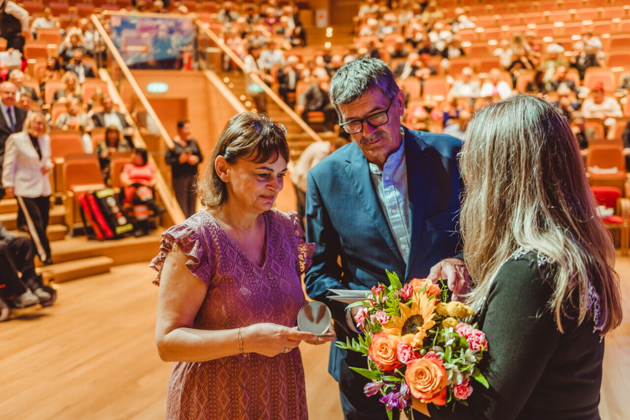 Gdańsk. W sali koncertowej Polskiej Filharmonii Bałtyckiej niemal 100 par odebrało z rąk prezydent Aleksandry Dulkiewicz gratulacje oraz wyjątkowe statuetki z bursztynem bałtyckim