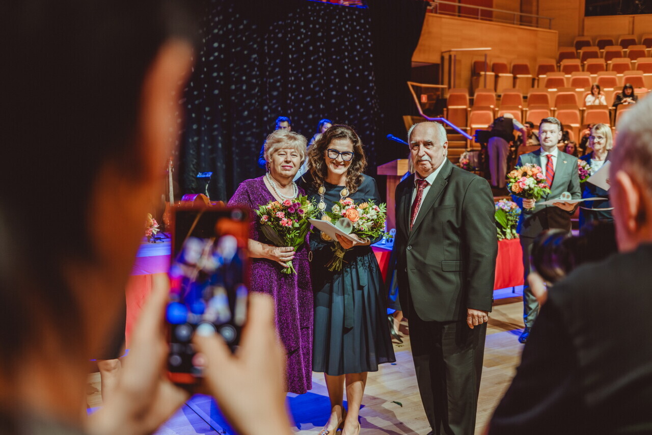 Gdańsk. W sali koncertowej Polskiej Filharmonii Bałtyckiej niemal 100 par odebrało z rąk prezydent Aleksandry Dulkiewicz gratulacje oraz wyjątkowe statuetki z bursztynem bałtyckim