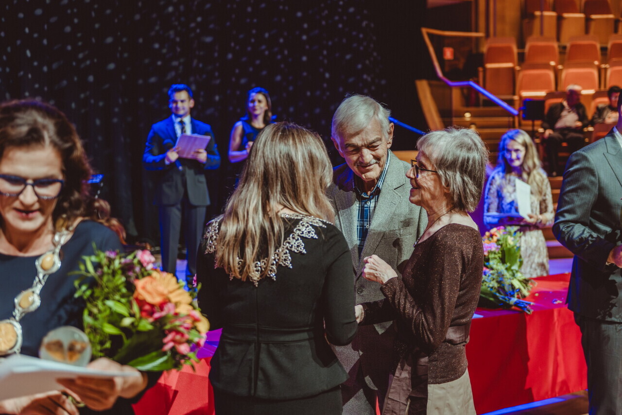 Gdańsk. W sali koncertowej Polskiej Filharmonii Bałtyckiej niemal 100 par odebrało z rąk prezydent Aleksandry Dulkiewicz gratulacje oraz wyjątkowe statuetki z bursztynem bałtyckim