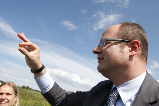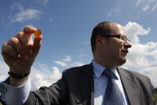 Prezydent Miasta Gdańska, wraz z dziennikarzami i funkcjonariuszami Policji i Straży Granicznej odwiedził miejsca legalnego wydobycia bursztynu, który na Gdańskich Stogach prowadzi firma Golden Amber. Nz. Paweł Adamowicz podziawia wydobyte bryłki bursztynu