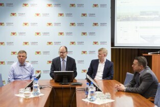 Urząd Miejski w Gdańsku. Konferencja prasowa poświęcona inauguracji obecności miasta Gdańska na internetowej platformie współpracy CivilHub. Nz. od lewej: Doradca Prezydenta Gdańska ds. Innowacji Tomasz Nadolny, Prezydent Gdańska Paweł Adamowicz, Grzegorz Warzecha z Fundacji CivilHub (twórca i fundator serwisu), Kierownik Referatu Komunikacji Społecznej UMG Maciej Kukla
