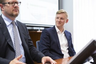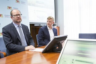 Urząd Miejski w Gdańsku. Konferencja prasowa poświęcona inauguracji obecności miasta Gdańska na internetowej platformie współpracy CivilHub. Nz. Prezydent Gdańska Paweł Adamowicz i Grzegorz Warzecha z Fundacji CivilHub (twórca i fundator serwisu)