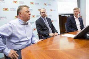 Urząd Miejski w Gdańsku. Konferencja prasowa poświęcona inauguracji obecności miasta Gdańska na internetowej platformie współpracy CivilHub. Nz. od lewej: Doradca Prezydenta Gdańska ds. Innowacji Tomasz Nadolny, Prezydent Gdańska Paweł Adamowicz, Grzegorz Warzecha z Fundacji CivilHub (twórca i fundator serwisu)
