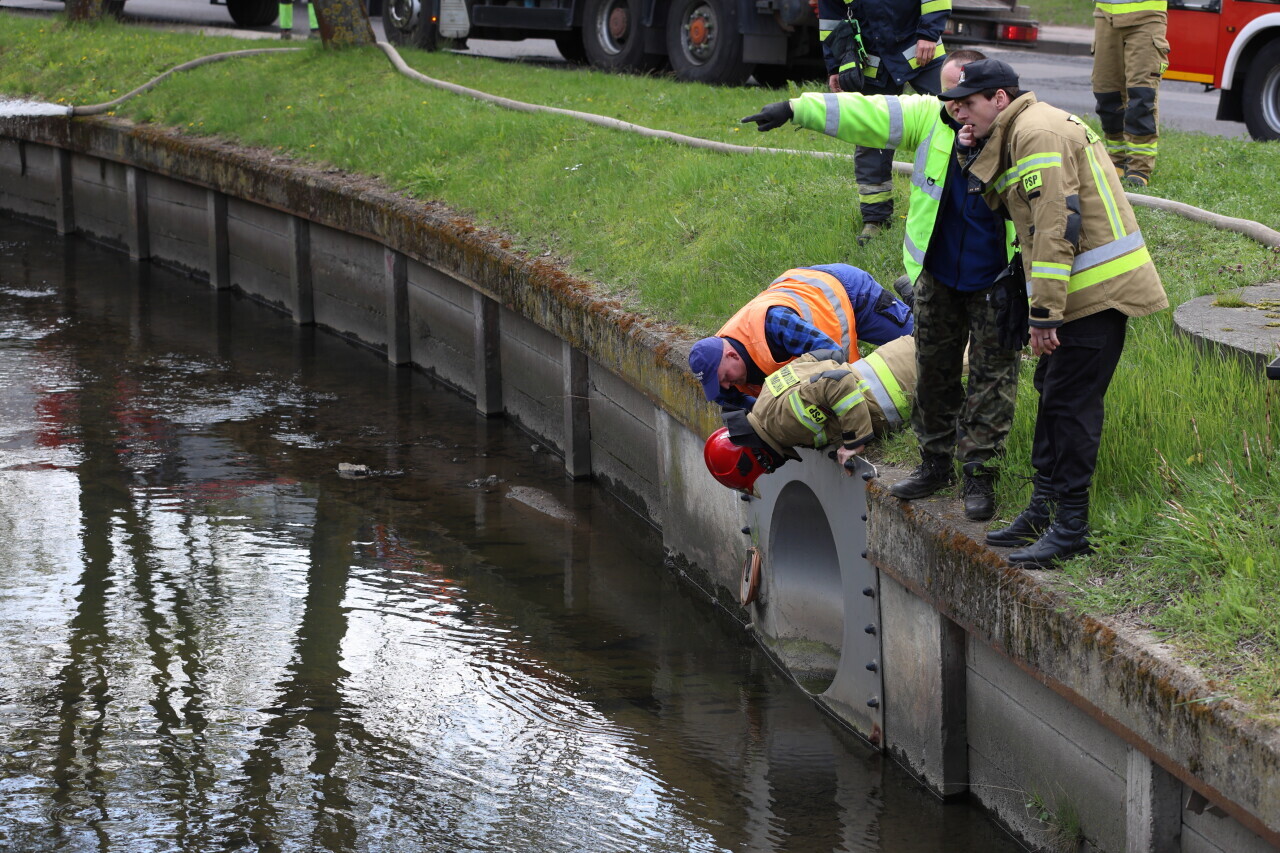 Gdańsk. Ćwiczenia przeciwpowodziowe. Ul. Swojska - na wysokości ul. Twardej i ul. Okrąg (podniesienie poziomu wody w potoku Strzyża spowodowanej cofką a w związku z tym brak możliwości skutecznego odprowadzania wody opadowej z trenów ul. Twardej, Okrąg i Swojskiej – zagrożenie podtopieniami lokalnymi). Działania polegające na ostrzeganiu mieszkańców, ustawieniu pomp i przepompowywaniu wody do kanału Strzyży w celu umożliwienia odpływu wody z ww. ulic. W zawiązku z działaniami i możliwym wystąpieniem wody wykonanie zabezpieczenia działań.