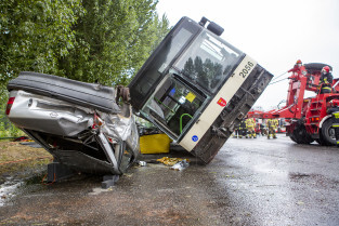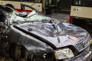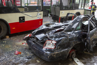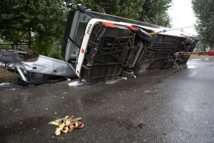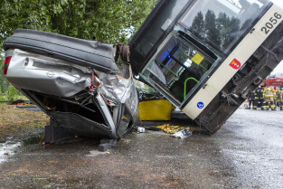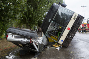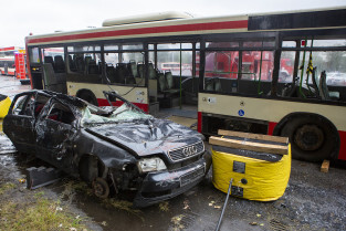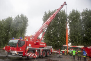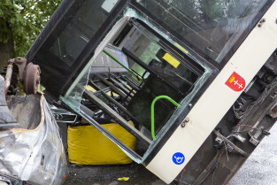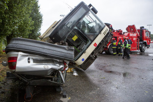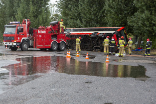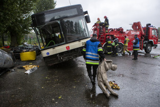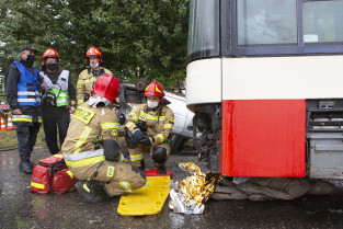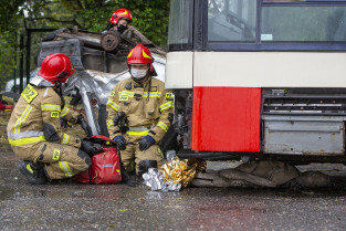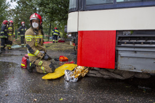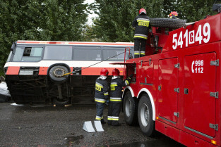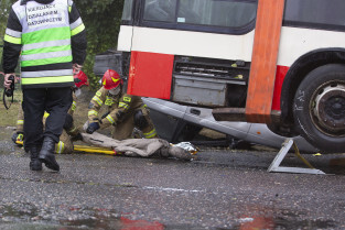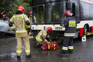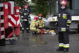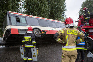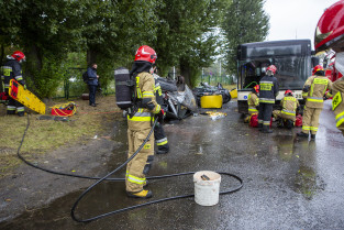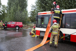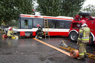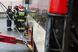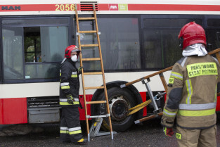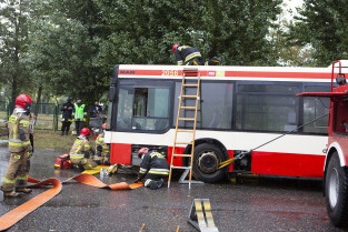 Ćwiczenia Państwowej Straży Pożarnej symulujące wypadek autobusu. Gdańsk, zajezdnia autobusowa Gdańskich Autobusów i Tramwajów przy al. Hallera