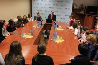 Urząd Miejski w Gdańsku. Spotkanie Prezydenta Gdańska Pawła Adamowicza z uczniami IV klasy III Społecznej Szkoły Podstawowej STO.