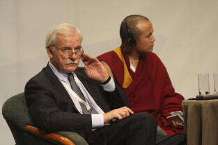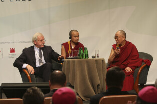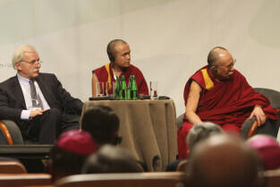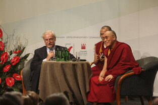 Konferencja Solidarność dla Przyszłości w ramach obchodów 25-lecia przyznania Lechowi Wałęsie Pokojowej Nagrody Nobla. Sesja 1: Czy Globalny Pokój Jest Możliwy. Nz. Andrzej Olechowski i Dalejlama XIV