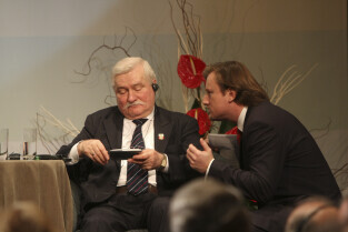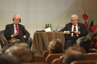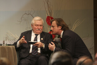 Konferencja Solidarność dla Przyszłości w ramach obchodów 25-lecia przyznania Lechowi Wałęsie Pokojowej Nagrody Nobla. Sesja 1: Czy Globalny Pokój Jest Możliwy. Nz. Lech Wałęsa i Piotr Gulczyński