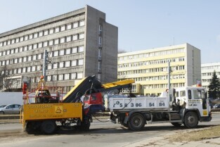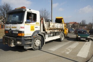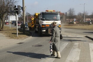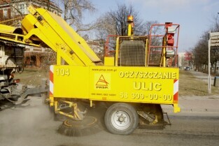 Gdańsk, Węzeł Groddecka. Ciężki sprzęt firmy PRSP S.A. czyści ulice z zalegającego po zimie piasku