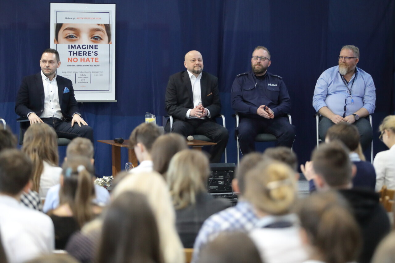 Gdańsk. Debata #POWSTRZYMAJ HEJT w Szkole Podstawowej nr 79. W debacie wzięli udział: Pan Maciej Dębski - Prezes Zarządu Fundacji Dbam o Swój Zasięg, Jacek Tylek – Radca Prawny, Dawid Owłasiuk - młodszy aspirant Komisariatu Policji w Gdańsku i Dyrektor szp 79 Michał Zapolski- Downar.