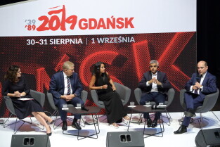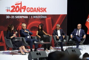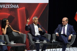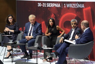 Gdańsk. Debata Solidarność i Pokój. Miasto jako Europejska Wspólnota. Goście: Aleksandra Dulkiewicz, Sadiq Khan, Sawsan Hebli, Tadeusz Truskolaski i Basil Kerski.