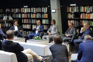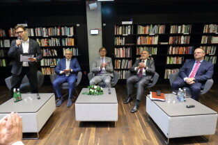Gdańsk. Debata - Ustawa metropolitalna szansą na dalszy rozwój Pomorza. Część ekspercka - Przyszłość Obszaru Metropolitarnego. Nz. Jakub Szlachetko - Prezes zarządu Instytutu Metropolitalnego, Grzegorz Kwitek, członek zarządu Górnośląsko-Zagłębiowskiej Metropolii, Mirosław Chyła Burmistrz Pelplina, Wojciech Szczurek-Prezydent Gdyni i Jakub Pietruszewski, dyrektor Pomorskiego Biura Planowania Regionalnego.