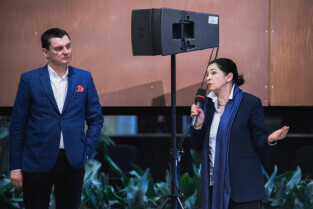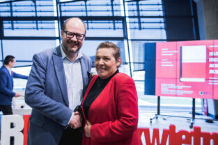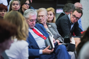 Gdańsk, Europejskie Centrum Solidarności. Debata "20 lat Konstytucji RP". Nz. Prezydent Gdańska Paweł Adamowicz i Irena Zielant