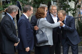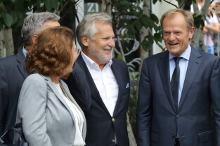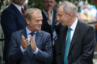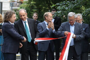 Sopot. Debata i odsłonięcie pomnika prof. Władysława Bartoszewskiego. Nz. Donald Tusk i Syn prof. Władysława Bartoszewskiego - Władysław Teofil Bartoszewski.