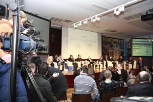 "ACTA? Debata o wolności i własności" - 4 lutego w historycznej Sali BHP Stoczni Gdańskiej odbyła się debata obywatelska nt. umowy dotyczącej zwalczania obrotu towarami podrobionymi ACTA.Nz. Adiunkt w Katedrze Prawa Międzynarodowego Uniwersytetu Gdańskiego Maciej Barczewski, Minister Administracji i Cyfryzacji Michał Boni, Wiceminister Kultury i Dziedzictwa Narodowego Piotr Żuchowski