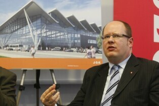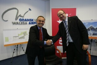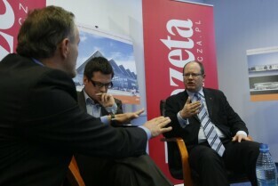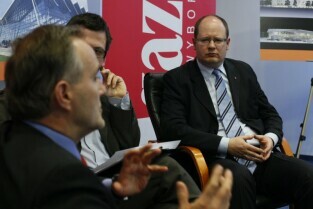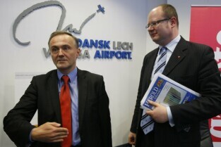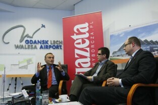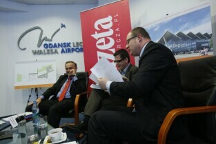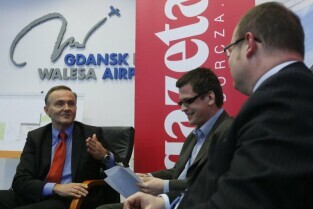Gdańsk, Port Lotniczy. Debata Prezydentów: Gdańska Pawła Adamowicza (po prawej) i Gdyni Wojciecha Szczurka (po lewej) poświęcona przyszłości lotnisk: gdańskiego w Rębiechowie i gdyńskiego w Kosakowie. Debatę zorganizowała Gazeta Wyborcza.