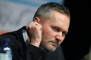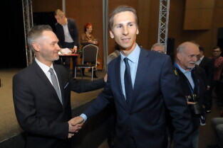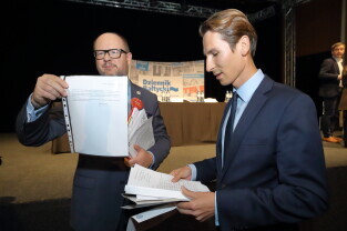 Gdańsk. Debata przedwyborcza kandydatów na prezydenta Gdańska, zorganizowana przez Dziennik Bałtycki. Nz. Kacper Płażyński (KW PiS/Zjednoczona Prawica) i Paweł Adamowicz (KW Wszystko dla Gdańska).