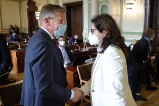 Gdańsk.Delegacja z Bremy na XXXIX sesji Rady Miasta Gdańska. Nz. Aleksandra Dulkiewicz i Frank Imhoff.