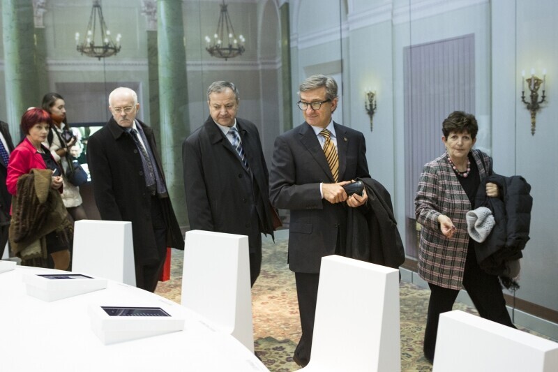Mer Mariupola Jurij Chotłubiej i Poseł do Rady Najwyższej Ukrainy Siergiej Taruta wraz z delegacją zwiedzają Europejskie Centrum Solidarności w Gdańsku. Po wystawie oprowadza Dyrektor ECS Basil Kerski