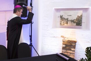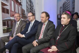 Gdańsk, północny cypel Wyspy Spichrzów. Wmurowanie kamienia węgielnego pod inwestycję Deo Plaza. Nz. Biskup pomocniczy Archidiecezji Gdańskiej Zbigniew Zieliński