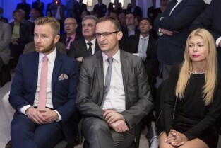 Gdańsk, północny cypel Wyspy Spichrzów. Wmurowanie kamienia węgielnego pod inwestycję Deo Plaza. Nz. od prawej: Biskup pomocniczy Archidiecezji Gdańskiej Zbigniew Zieliński, Marszałek Woj. Pomorskiego Mieczysław Struk, Prezydent Gdańska Paweł Adamowicz